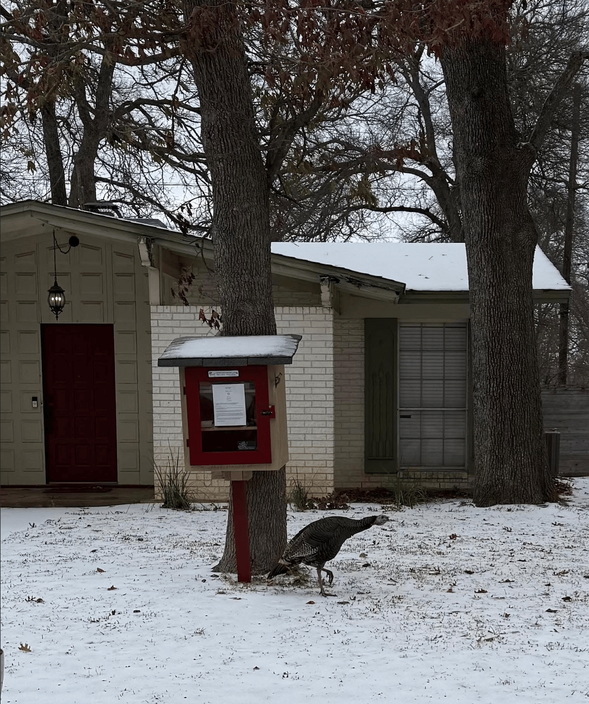 Within a week, Northwest Hills residents had begun referring to her as “our neighborhood friendly turkey.” Photos appeared daily, capturing her wandering through different corners of the neighborhood. On January 1, 2026, the Facebook group updated its cover photo with a newly designed logo featuring a striking image of the turkey at its center. That same day, the group launched a poll to name her. Two names quickly rose to the top—Dolores and Margo—with Dolores ultimately winning (though some neighbors spelled it “Delores”).