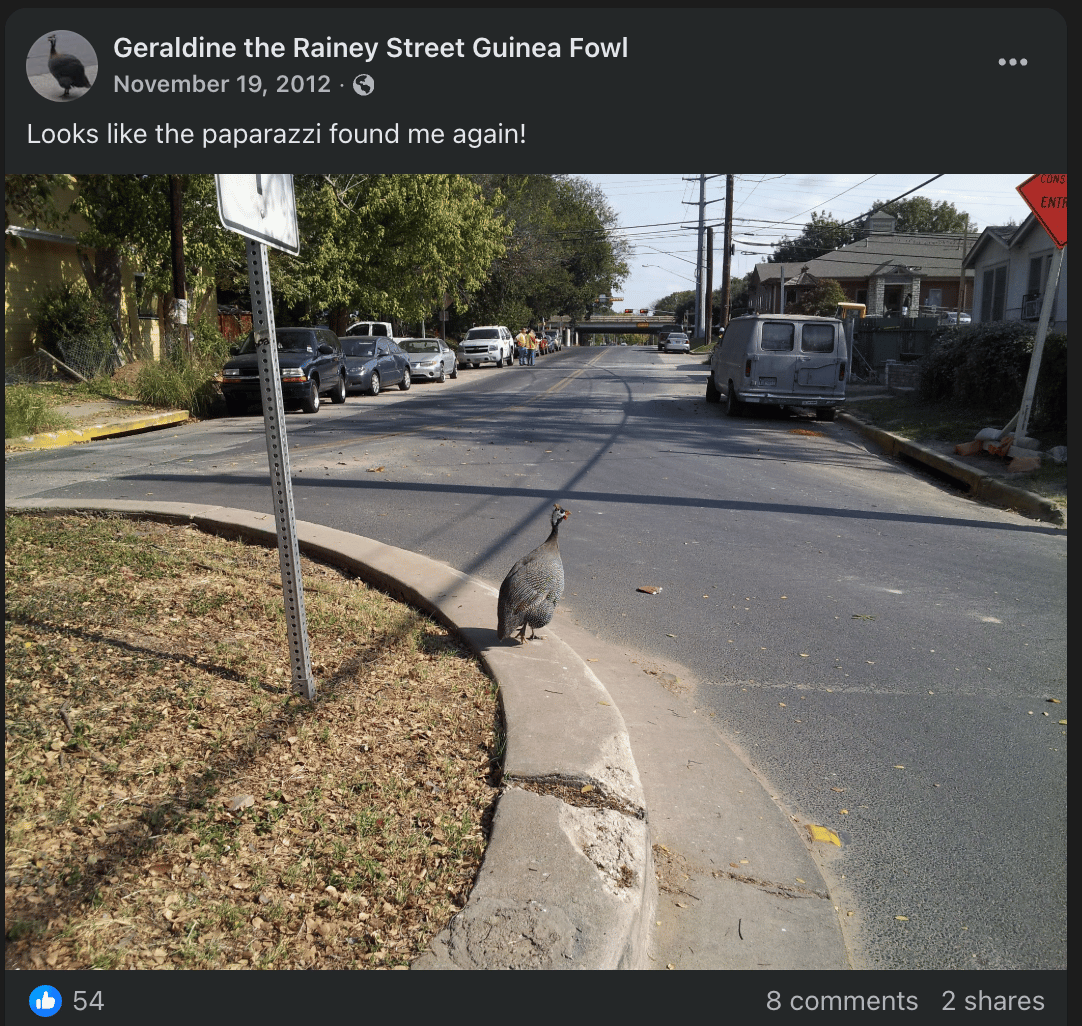 Geraldine was a Guinea hen who lived on Rainey Street in the early 20teens, and she pecked her way into our collective souls.