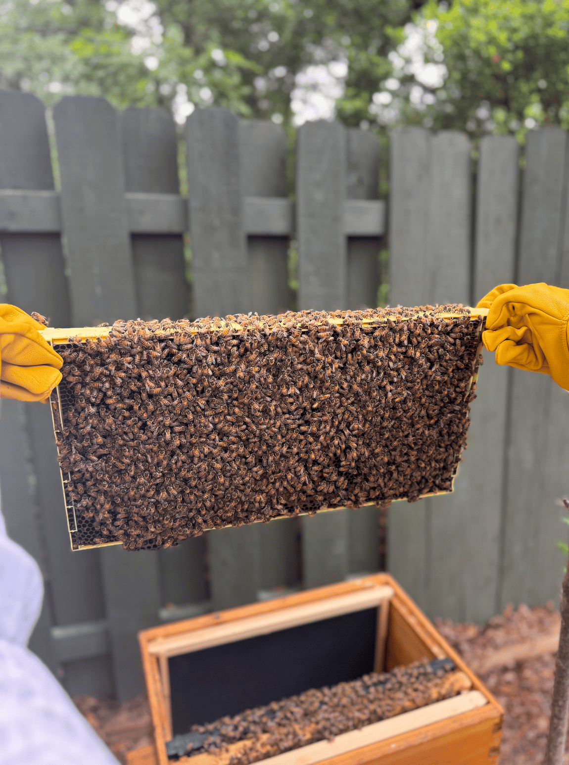 What I was: in awe. Acutely aware of my very emerging literacy of bees, but immediately soothed by their collaborative purpose—so certain of their roles, so amenable to being gently brushed aside for finger-gripping frames, transported from carrier to brood box. To see how incredibly many bees were diligently working on the frames. To be so very careful not to pinch a small body with my oversized leather fingers.