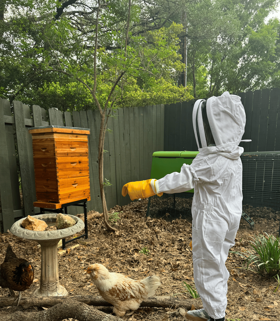 I traded him some eggs for information. Learned that swarm capturing is a thing. Got his eyes on my backyard to consider whether hens and bees could cohabitate in the corner I’d been eyeing. Mid convo, I noticed my gate was ajar, my hen in the greenbelt, and so a very paddle cactus-laden poultry rescue mission. By the time Penny was safely underarm, bees were officially in my 2-5 year plan.