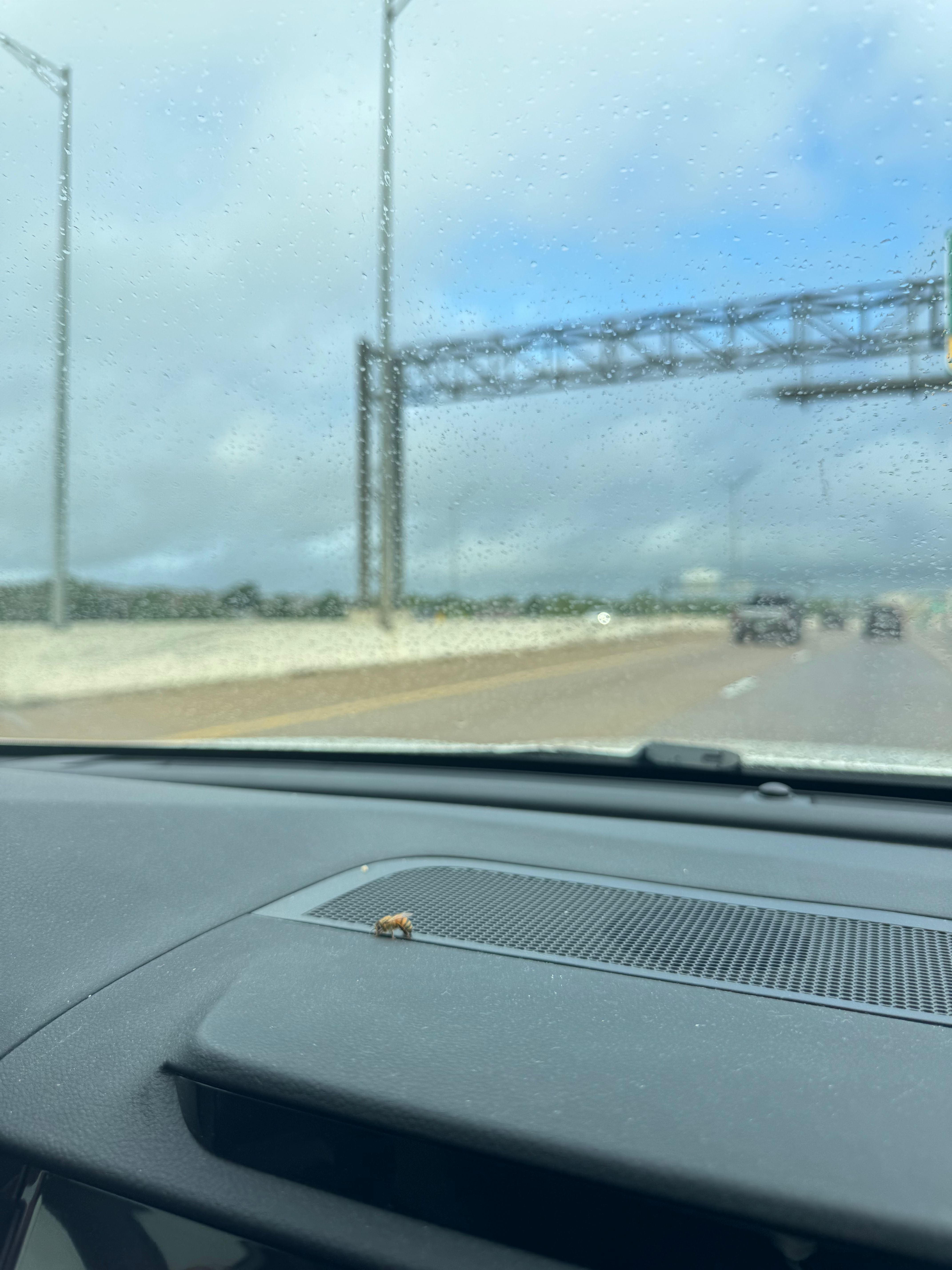 And so, with sputtering gray clouds, a low, steady thrum of bees and the growing contingent in the back window. One curious worker perching on the dashboard for the duration.