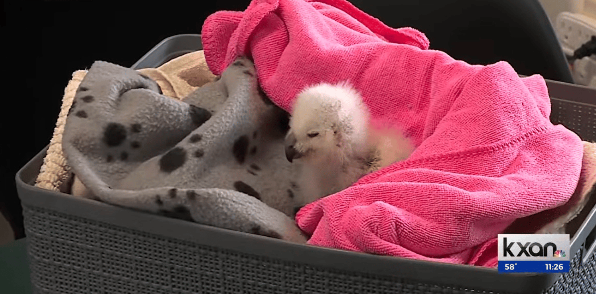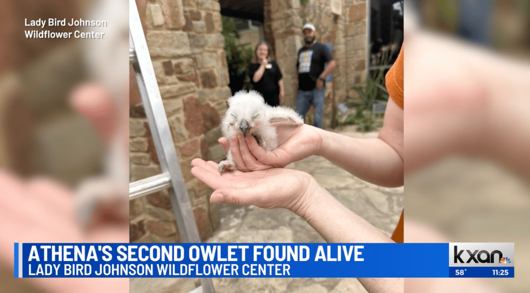 When Athen abandoned the nest April 19, it seemed like that was that. But with monitoring and a call to the Austin Wildlife Rescue, executive director Jules Maron climbed the ladder for a site check and found owlet #2 alive.